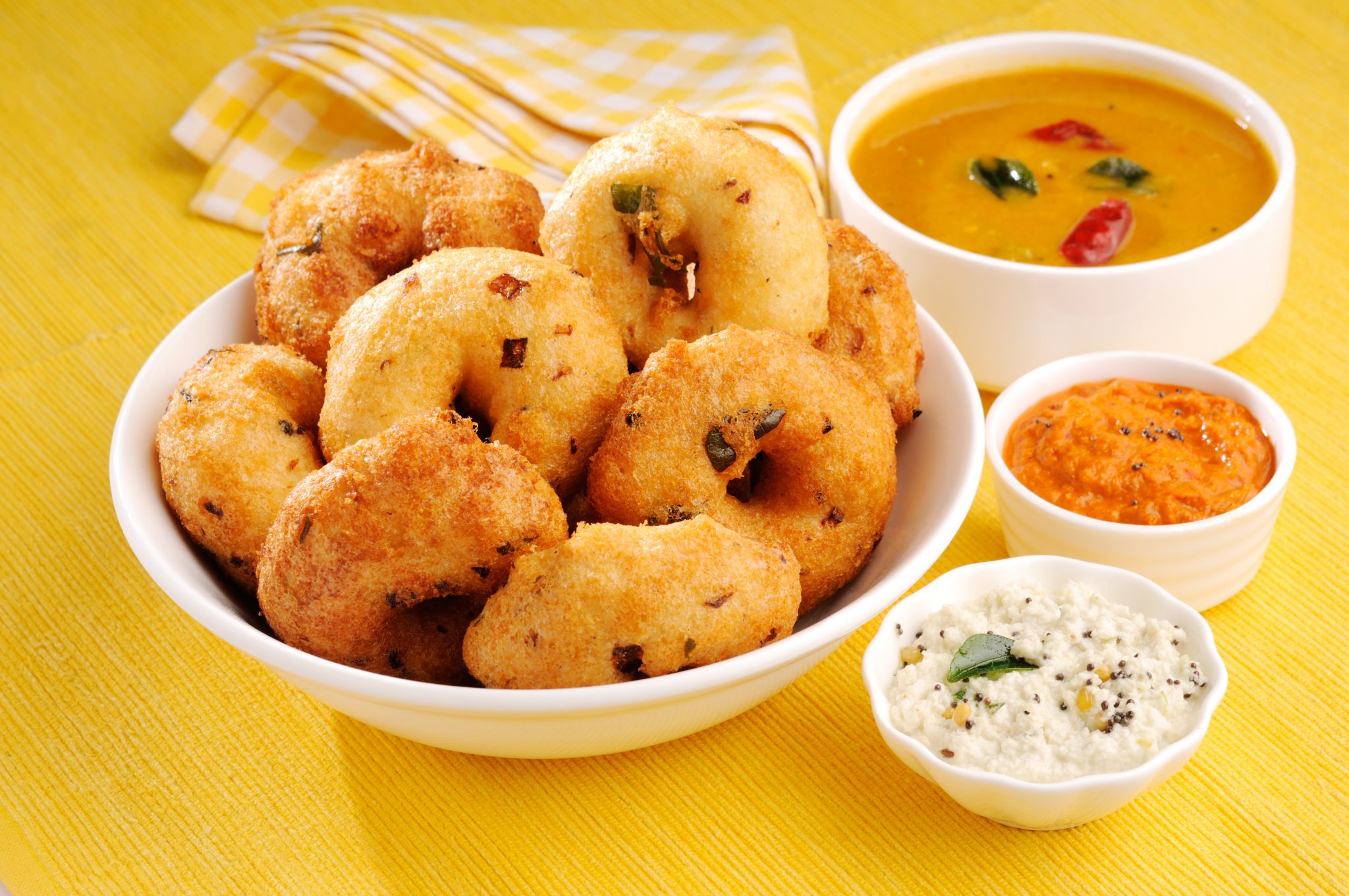 Crispy savory lentil doughnuts served with sambhar and coconut chutney