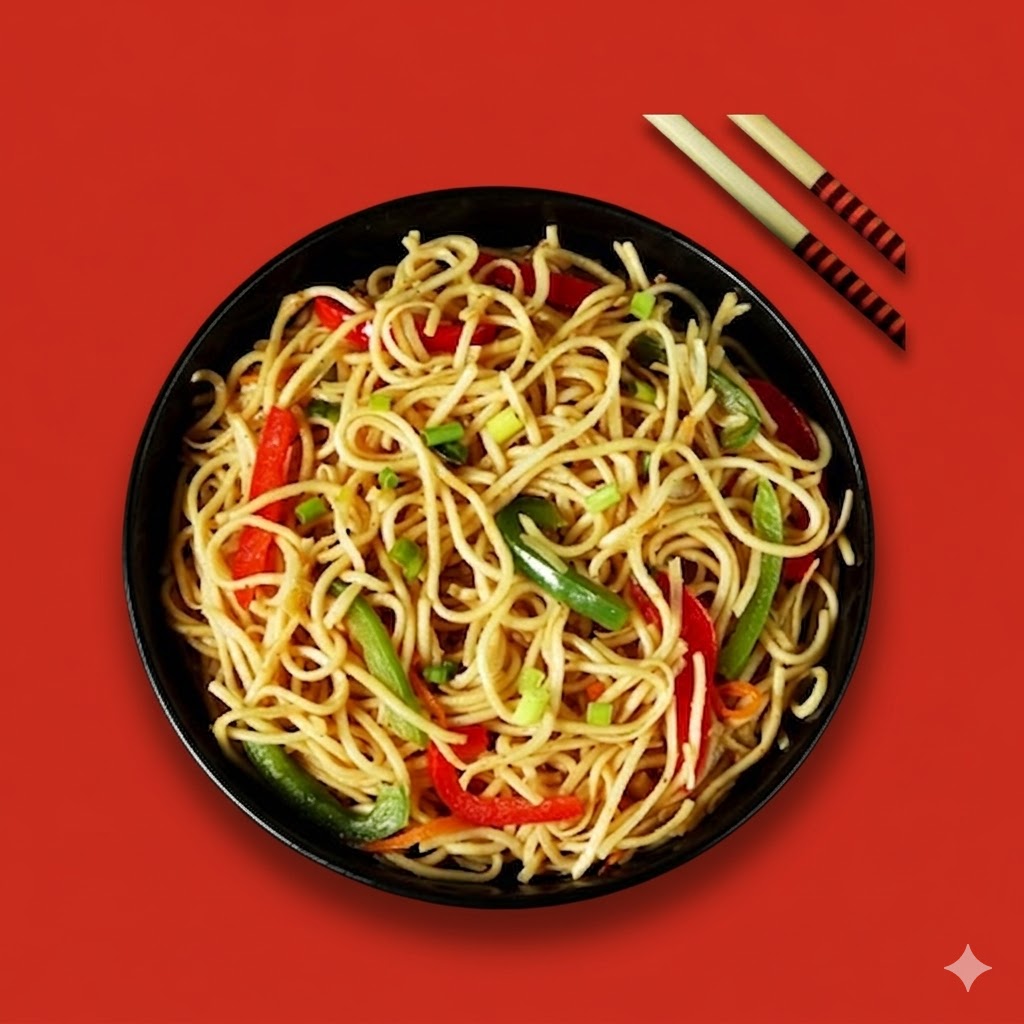 Vegetable hakka noodles onion, cabbage, bell pepper and carrots.
