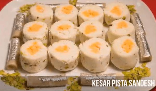 These are rasgullas rolls which are interlaced with sandesh and presented attractively.