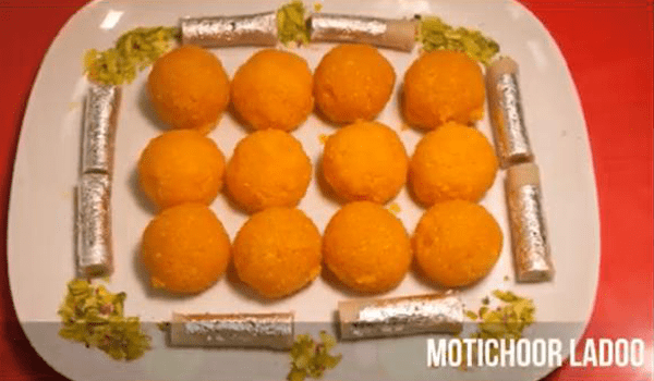 Motichoor Ladoo made from besan bits, chopped dry fruits, saffron, cardamom, silver leaves, and ghee.